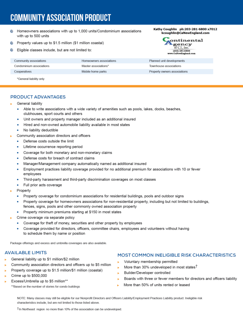 Community Association Directors & Officers is handled by Kathy Coughlin. Please complete the Community Assoc. D&O Application in order to quote.